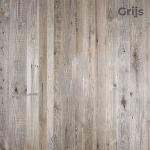 Onze 3-layer panels van oud hout zijn gemaakt van een laag oud hout aan de bovenkant en twee lagen nieuw grenen aan de onderkant. Elke panel is ongeveer 1,2 cm dik en heeft een breedte van 122 cm. De lengte varieert tussen de 100 cm en 400 cm, maar is standaard 150cm. Heb je een andere maat nodig? Neem dan contact met ons op.